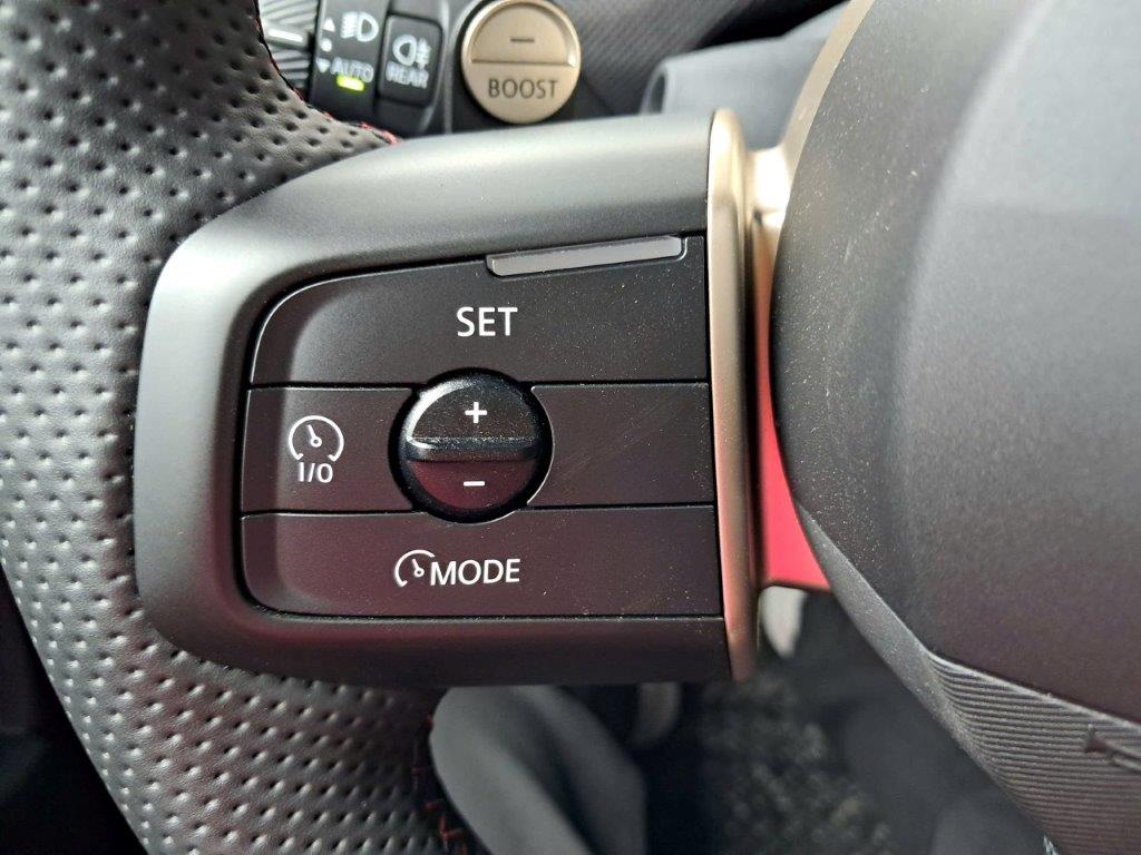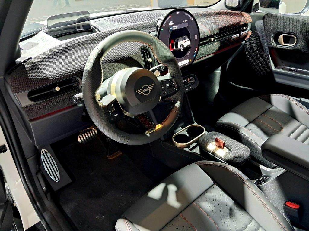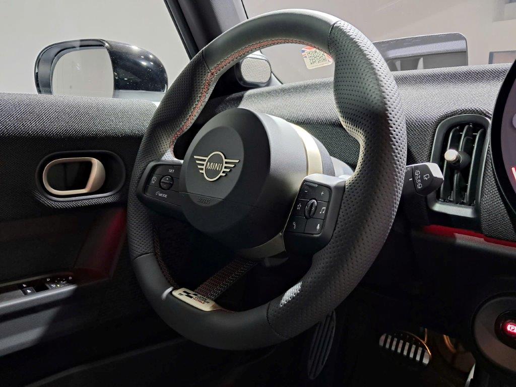 Vô lăng (có tính năng sưởi) kiểu sport và thời trang với logo kim loại in chữ John Cooper Works kèm hình cờ đua gắn ở vị trí 6h, tuy vậy không tạo hình D-cut như thường thấy trên dòng xe thể thao mà tròn trịa, tạo sự hài hòa với xu hướng chủ đạo của tổng thể xe.