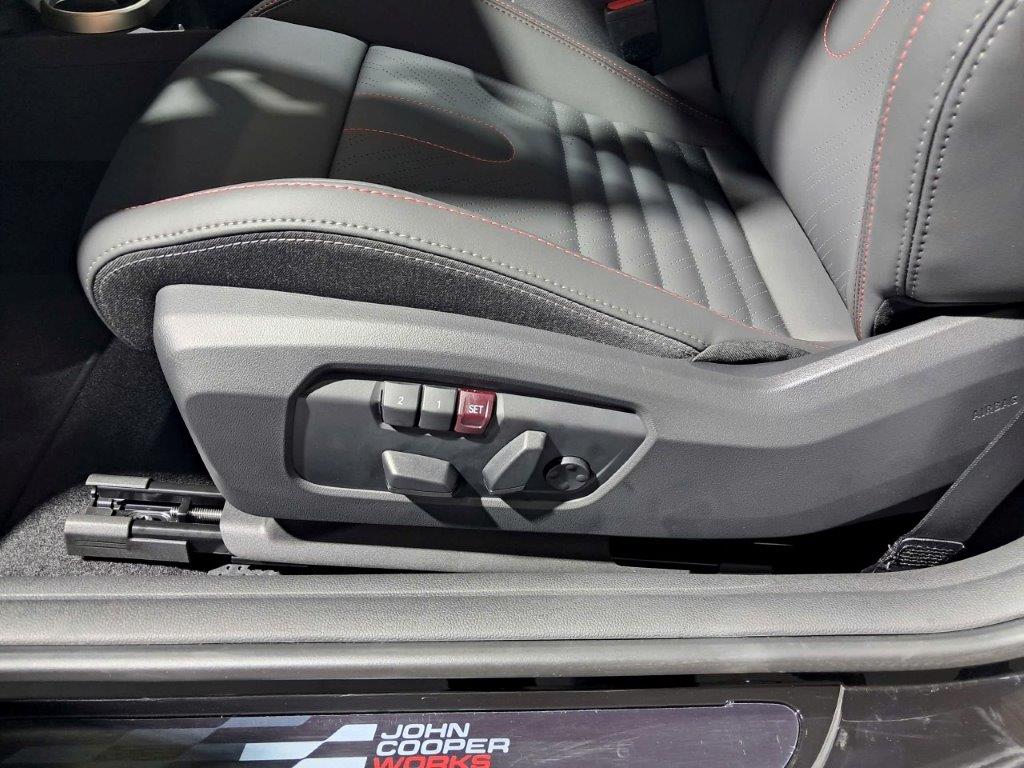 Ghế phong cách thể thao John Cooper Works với tựa lưng và tựa đầu liền khối, viền hông ghế dày giúp ôm khít hông người ngồi, giảm say xe. Hàng ghế trước chỉnh điện, trong đó ghế lái có nút chỉnh viền hông, bơm lưng, mát-xa thư giãn cơ bắp trên hành trình dài. Tính năng nhớ 2 vị trí ghế và gương chiếu hậu. Gương chiếu hậu bên ngoài tự động gập hỗ trợ chế độ đỗ xe tự động. Chế độ ga tự động Cruise Control chạy đường trường không cần thường xuyên đạp ga.