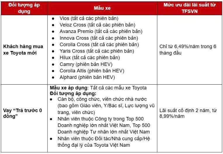 Lưu ý: Để được tư vấn về Thông tin và điều kiện áp dụng chi tiết của chương trình ưu đãi lãi suất của TFSVN trong tháng 4/2026, Quý khách hàng vui lòng tham khảo thông báo từ TFSVN hoặc liên hệ các Đại lý Toyota trên toàn quốc.