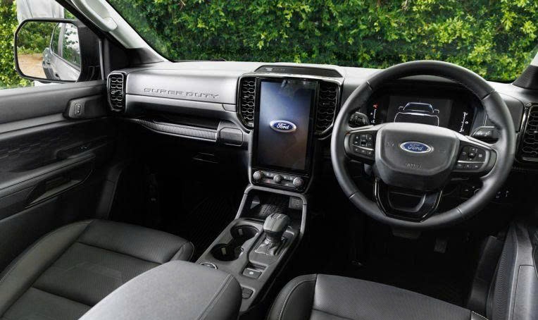 Ngoại thất của Ford Ranger Super Duty mang đậm chất xe công trình với cản trước bằng thép cứng, các móc kéo cỡ lớn và tấm bảo vệ gầm chuyên dụng. Điểm nhận diện đặc trưng là bộ mâm 18 inch sử dụng cấu trúc 8 bu-lông thay vì 6 như thông thường, đi kèm lốp địa hình 33 inch để chịu được áp lực tải lớn. Bên trong khoang lái, Ford vẫn duy trì sự tiện nghi cao cấp với màn hình giải trí 12 inch tích hợp hệ thống SYNC4, ghế da chỉnh điện và hệ thống điều hòa hai vùng độc lập.