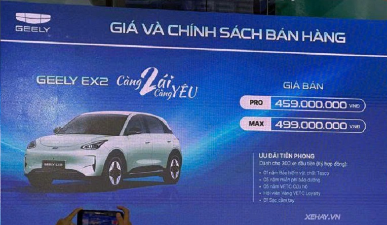 Ngày 27/3, Geely chính thức giới thiệu mẫu xe đô thị cỡ nhỏ EX2 tại thị trường Việt Nam. Theo đó, xe được phân phối với 2 phiên bản Pro và Max đi cùng giá bán lần lượt là 459 triệu đồng và 499 triệu đồng.