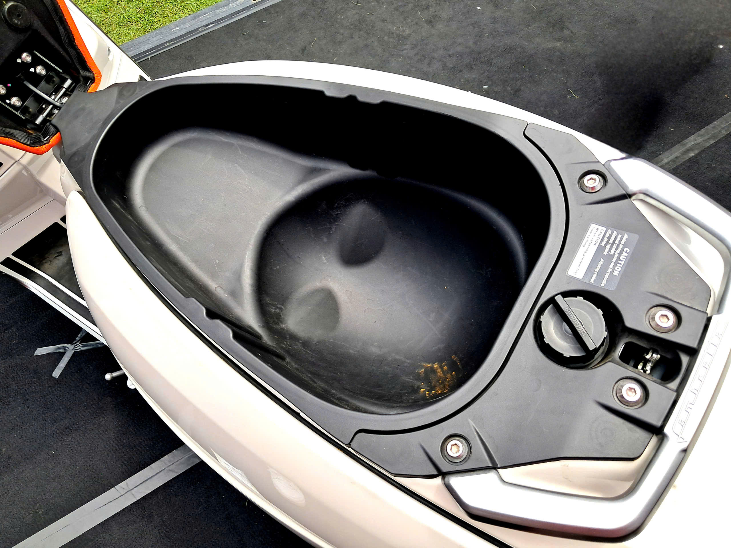 Khoang hành lý dưới yên cất được một mũ bảo hiểm toàn đầu Full Face. Nắp bình xăng dưới yên.