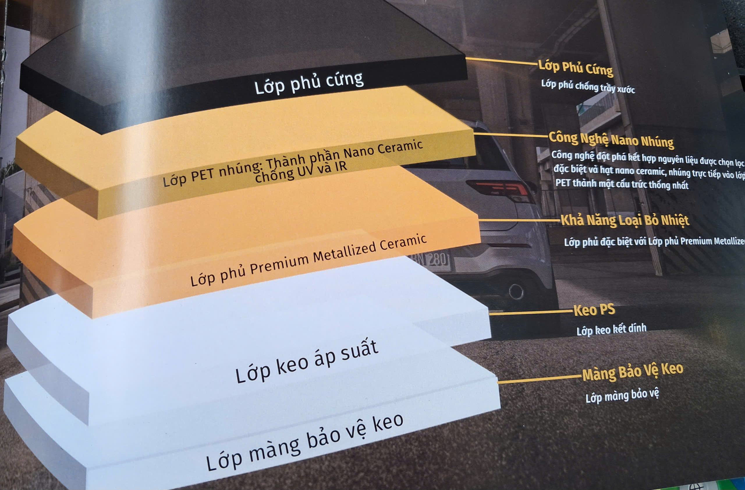 Sản phẩm phủ lớp nano ceramic siêu mịn, nâng cao khả năng loại bỏ nhiệt lượng từ tia hồng ngoại và tia UV, đồng thời bảo đảm độ trong suốt cao cho kính xe, giảm hiện tượng chói lóa mà không ảnh hưởng màu sắc tự nhiên. Lớp phủ cứng chống trầy xước, tăng khả năng chịu va đập, giữ bề mặt phim sáng đẹp. Lớp keo PSA chuyên dụng giúp phim bám chắc trên bề mặt kính, không bong tróc hay rộp.