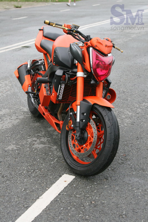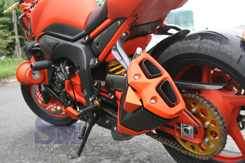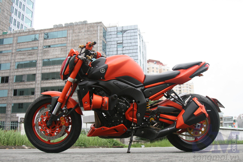 Chiếc nakedbike Yamaha FZ1 tuy đắt tiền nhưng ngắm mãi xe nguyên thủy cũng chán, chủ xe sau nhiều ngày suy nghĩ đã dốc một số tiền khá lớn để biến chiếc xe thành một tác phẩm di động thu hút mọi ánh nhìn, khoe bộ cánh rực rỡ trên phố Sài thành.