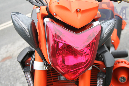 Nhìn bao quát, chiếc FZ1 trông đầy chất chơi nhờ lớp sơn nhám màu cam được chọn lọc phủ lên các chi tiết góc cạnh trên xe nhằm tạo hiệu ứng 3D. Khi nhìn gần, trong ánh nắng, sơn xe phản chiếu màu vàng ánh hạt kim tuyến lóng lánh đẹp mắt. Cụm gương chiếu hậu “độ” cặp sát hai bên chóa đèn pha, không những siết bố cục phần đầu xe thêm chặt chẽ mà còn tạo lợi thế quan sát khi ôm cua sát đường.