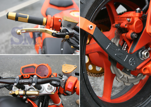 Tăng cường sức mạnh cho đĩa tăng tốc là hệ thống cần chuyển số cực nhanh, bộ lọc gió (bô e) tính năng cao. Bên cạnh đó còn có thanh trợ lực tay lái hiệu HyperPro RSC (Reactive Speed Control) nổi tiếng của Hà Lan, giá gần 9 triệu đồng, cải tiến hệ thống van thông minh tăng dần lực tác động khi xe tăng tốc (cảm nhận qua độ rung tay lái) mà loại trợ lực CSC không có. Do đó, khi xe chạy chậm thì ghi-đông vẫn xoay trở nhẹ nhàng, nhưng khi xe lao nhanh hoặc chạy trên đường gồ ghề thì cảm giác đánh lái sẽ nặng và đằm hơn. Ghi-đông Rizoma loại thanh ngang thể thao với 6 nấc điều chỉnh sẽ cố định độ cao tay cầm lái thật vừa vặn thể hình của người lái, giúp thoải mái chuyển hướng xe linh hoạt và chắc chắn hơn.