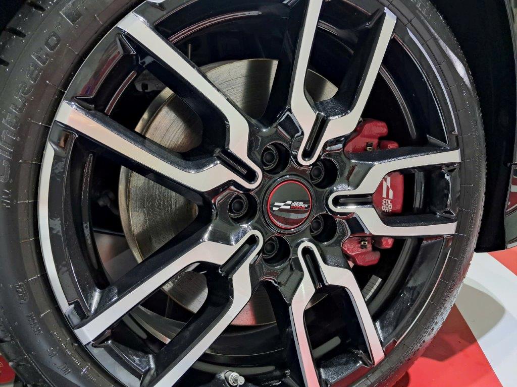 Bánh mâm đúc 5 cánh kép thẳng góc tôn sự cứng cáp. Cỡ lốp trước sau đều là 215/40R18, bề ngang hơn lốp hatchback thường 50mm giúp tăng độ bám đường khi vào cua gắt với tốc độ cao.
