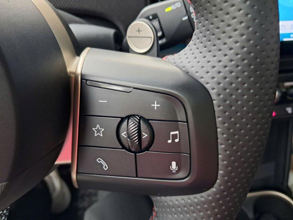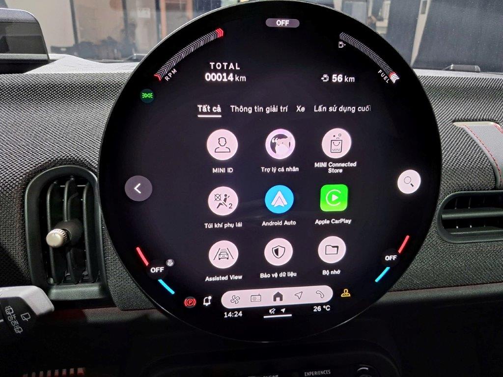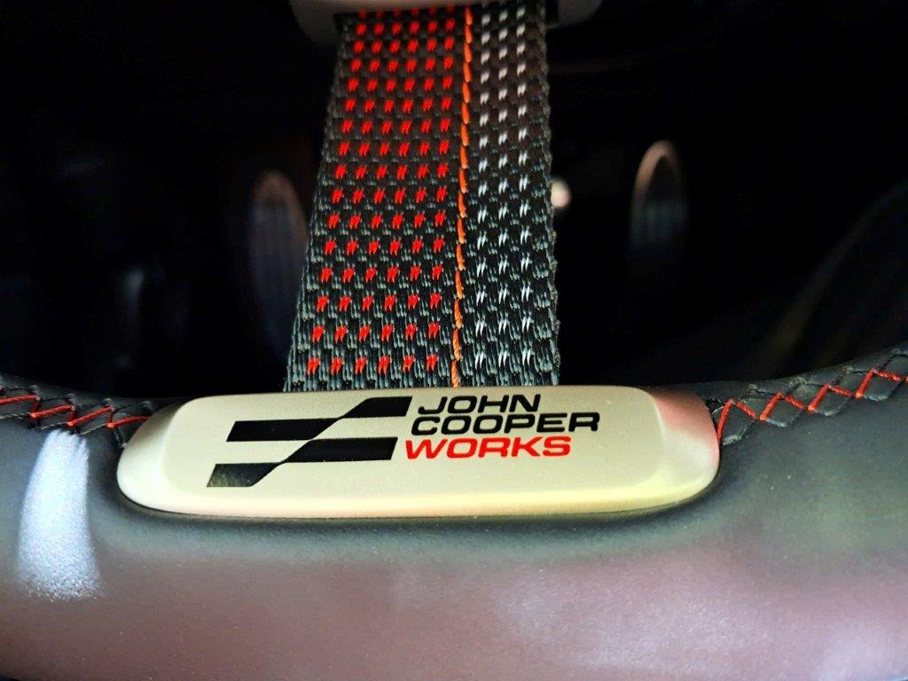 Vô lăng (có tính năng sưởi) kiểu sport và thời trang với logo kim loại in chữ John Cooper Works kèm hình cờ đua gắn ở vị trí 6h, tuy vậy không tạo hình D-cut như thường thấy trên dòng xe thể thao mà tròn trịa, tạo sự hài hòa với xu hướng chủ đạo của tổng thể xe.