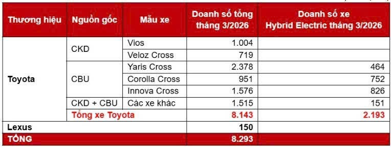 Công ty Ô tô Toyota Việt Nam (TMV) công bố doanh số bán hàng trong tháng 3/2026 đạt 8.293 xe (bao gồm xe Lexus).
