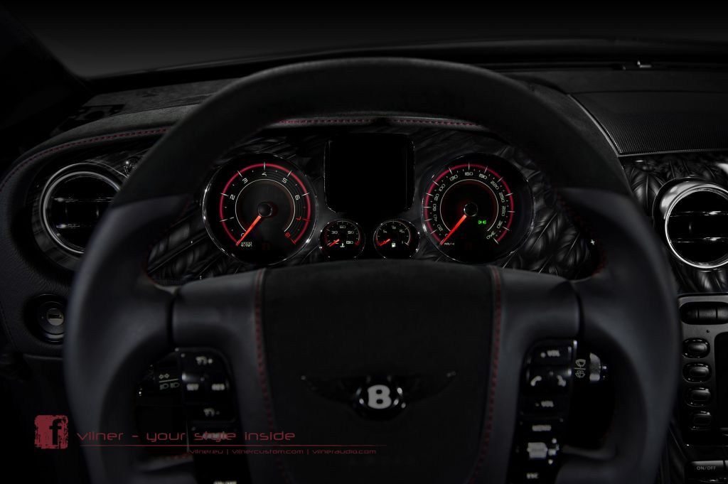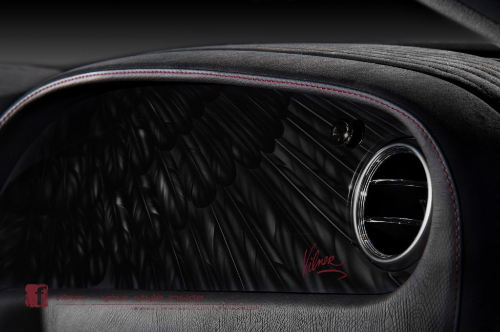 Bên trong, nội thất cũng được thay đổi hoàn toàn mới. Vilner đã phủ toàn bộ nội thất của chiếc xe bằng chất liệu da đắt tiền - Alcantara. Bảng tap-lô với bề mặt được sơn phủ bóng kính với họa tiết vân lông chim như một bản vẽ tay, thay vì kiểu ốp vân gỗ thông thường. Vô lăng xe cũng được “độ” lại về hình dạng với kiểu dáng mới để đảm bảo vừa vặn với tay nắm của chủ xe.