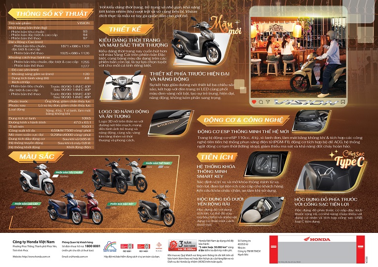 Ra mắt lần đầu năm 2011, Vision đã chính thức ghi danh vào dòng xe tay ga nhỏ gọn, nhưng đa dụng của HVN. Nhằm bắt kịp nhịp chuyển mình trong phong cách thời trang của người dùng, HVN đã chính thức ra mắt phiên bản mới cho Vision 2025 với bộ sưu tập màu sắc mới mẻ và hiện đại. Mỗi phiên bản đều được phối màu tinh tế, thể hiện qua từng chi tiết.