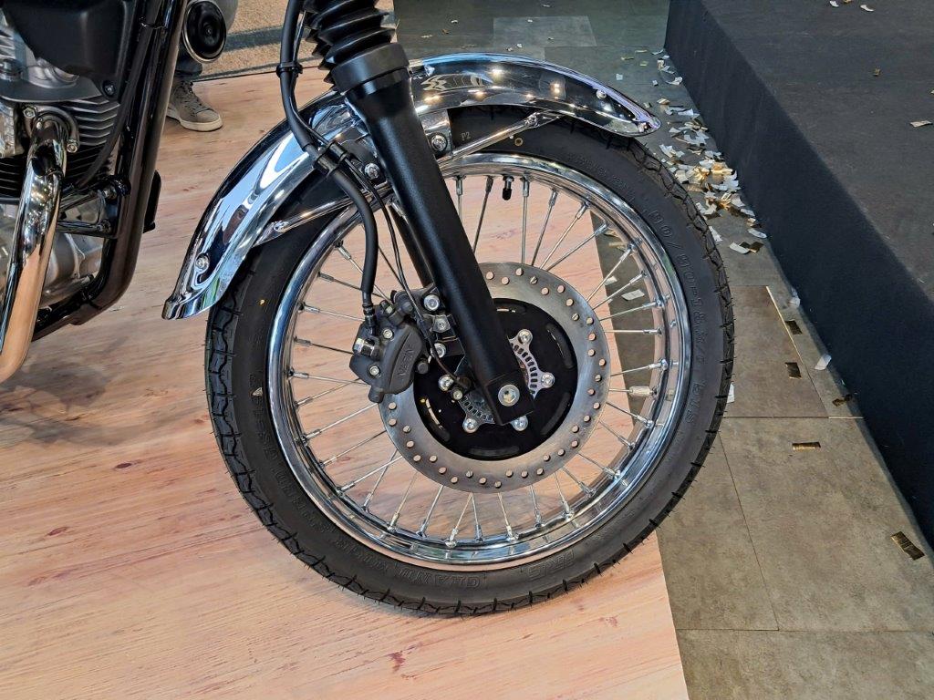 Phuộc trước kéo dài từ tay lái với chụp cao su ruột gà chống bụi, bánh căm, vành xi mạ sáng bóng, vè chắn bùn bằng kim loại mạ crôm.
