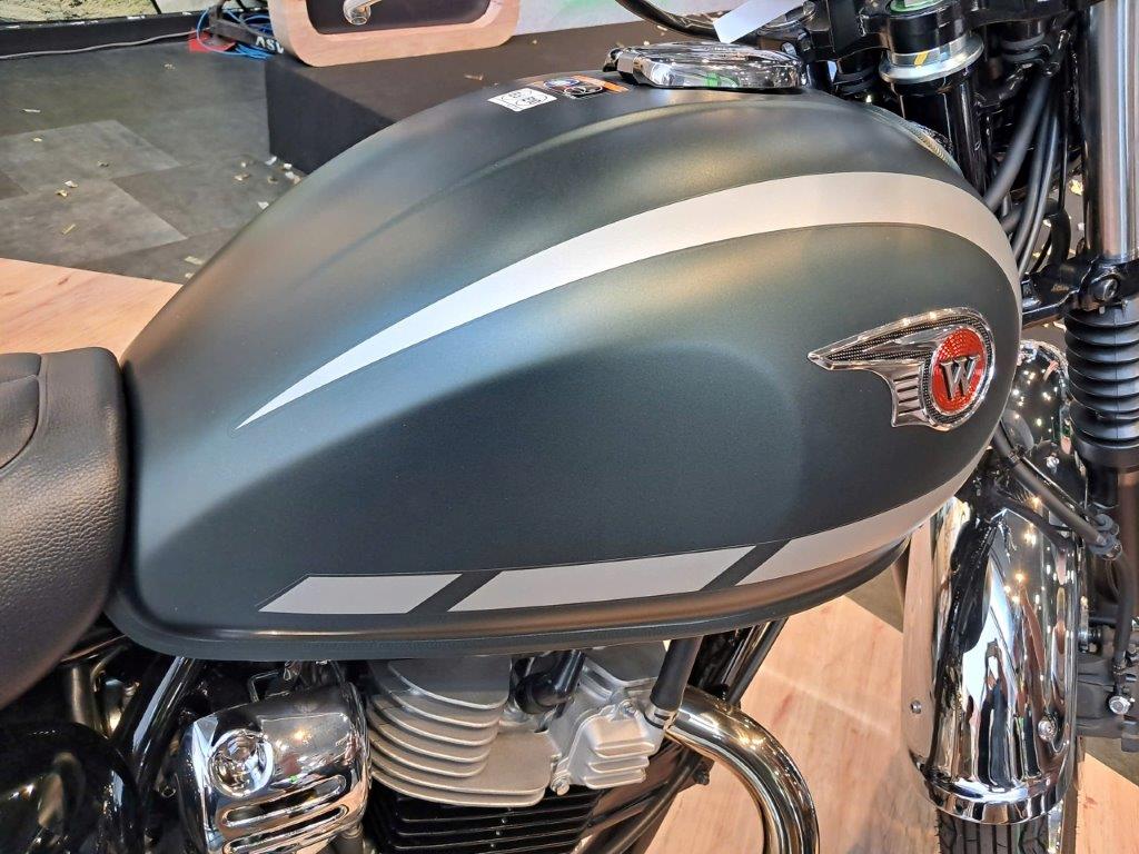 Kawasaki W230 có bình xăng hình giọt nước kích cỡ khá lớn so với tổng thể thân xe, tạo điểm nhấn đậm chất cổ điển cho ngoại thất. Trên bình xăng nổi bật logo W màu đỏ kim loại in nổi 3D. Hai bên hông bình xăng vát thuôn gọn giúp biker dễ dàng khép gọn đùi, tư thế lái xe an toàn hơn.