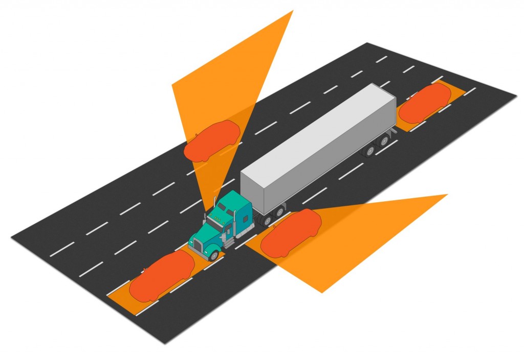 Những chiếc xe siêu trường, siêu trọng có rất nhiều điểm mù quanh xe như hai bên hông, phía sau xe, một phần phía trước gần đầu xe. Vì vậy, khi gặp những chiếc xe lớn, không nên chạy song song với chúng, nếu người lái không nhìn thấy mặt của tài xế xe tải/xe buýt trên gương chiếu hậu, đồng nghĩa với việc tài xế cũng sẽ không nhìn thấy bạn đang lưu thông gần họ.