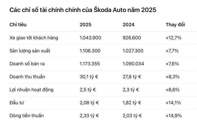 Theo báo cáo tài chính của hãng, năm 2025, Skoda Auto đạt doanh thu 30,1 tỷ Eeuro, tăng 8,3% so với năm 2024. Lợi nhuận hoạt động đạt 2,5 tỷ Euro, tăng 8,6%, trong khi tỷ suất lợi nhuận trên doanh thu (ROS) duy trì ở mức 8,3% - con số được đánh giá cao trong nhóm các thương hiệu xe phổ thông.