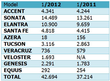 Hyundai Motor America hôm nay vừa thông báo, hãng đã bán được 42.694 xe trong tháng 1/2012, tăng 15% so với cùng kì năm ngoái.
