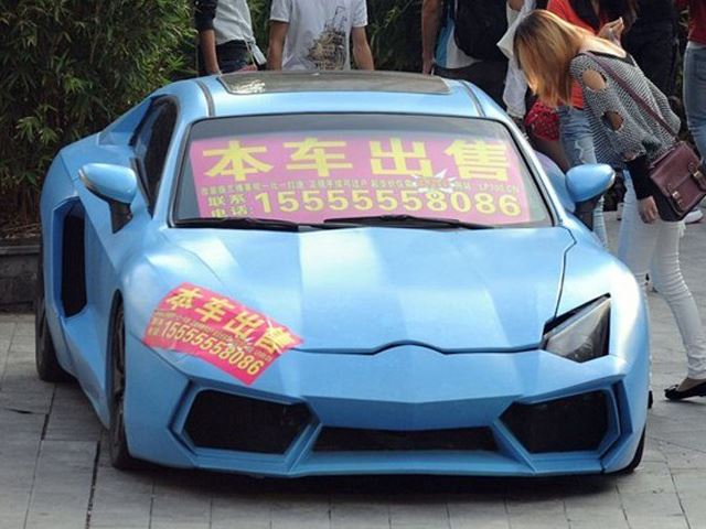 Tuy nhiên anh chàng "Lambo" này sau khi hoàn thành công việc đầy sáng tạo, đã hành động hơi khác đôi chút về cách khoe xe, có thể là hơi cả tin quá vào "truyền thống" làm giả của dân tộc. Anh chàng đã lên cơn bốc đồng, đem chiếc xe ra công khai bày trong một bãi đậu xe, với cả tấm biển quảng cáo rao bán xe to tướng đỏ chót chình ình giữa phố. Không biết là anh chàng định bán xe, hay chỉ tò mò xem có bao nhiêu người sẽ sẵn sàng trả tiền cho chiếc "Lamborghini Aventador" này. Hoặc cũng có thể anh ta đang định lừa một ai đó mua chiếc Aventador giả này thật!? Biết đâu đấy, ở cái đất nước có số lượng người thành triệu phú tỷ phú chỉ sau 1 đêm và thậm chí còn chưa học hết đếm.. nhiều nhất thế giới này thì chẳng có gì là không thể.
