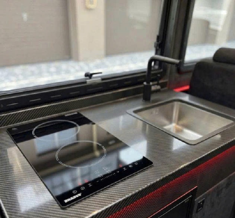Theo các hình ảnh được công bố, khoang nội thất của chiếc xe mang phong cách sang trọng với chất liệu Alcantara đen và sợi carbon bao phủ khắp nơi, từ cửa nhà vệ sinh đến bệ bếp. Không gian bên trong được mô phỏng vô cùng rộng rãi, vượt xa kích thước thực tế của dòng G-Class.
