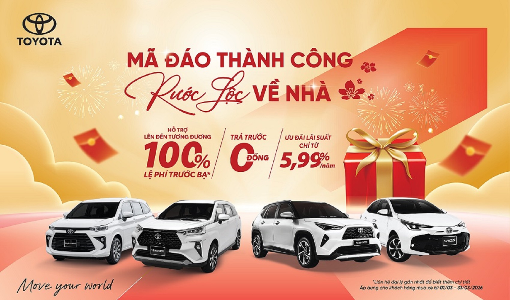 Toyota Việt Nam (TVM) và Công ty Tài chính Toyota Việt Nam (TFSVN) phối hợp cùng hệ thống đại lý trên toàn quốc triển khai chương trình khuyến mại hấp dẫn dành cho khách hàng mua ô tô trong tháng 3/2026. Động thái này nhằm mang đến khách hàng cơ hội hữu ô tô mới với nhiều trải nghiệm thú vị bên gia đình, người thân.