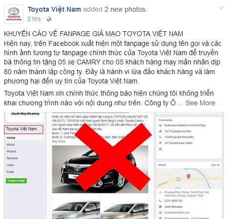 Toyota Việt Nam vừa khuyến cáo về một fanpage giả mạo sử dụng tên gọi và các hình ảnh tương tự fanpage chính thức của hãng để truyền bá thông tin về chương trình tặng 5 xe Camry cho khách hàng nhân dịp 80 năm thành lập.