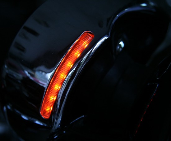 Dải inox viền trên mặt nạ chắn gió có đèn tín hiệu báo rẽ.