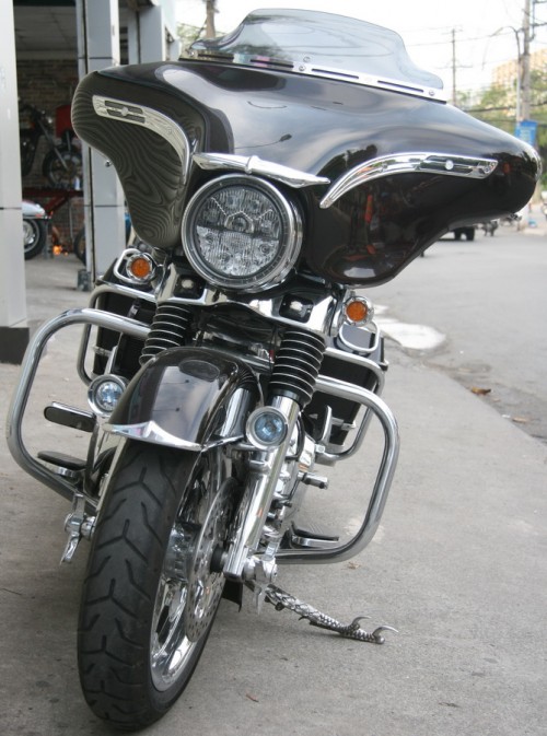 Một dân chơi môtô Sài Gòn đã bỏ ra 450 triệu đồng để trang bị bộ cánh mới tạo sự khác biệt cho chiếc Harley-Davidson dòng touring Street Glide 2011. Chiếc môtô trị giá 1 tỷ đồng nay được thay đổi những chi tiết mới lạ như bánh mâm cánh hình tia chớp, tựa lưng ghế “2 trong 1”, chân chống xe hình móng vuốt, ốp bô e (air) tăng cường hiệu năng hút gió, đèn pha 9 bóng LED…