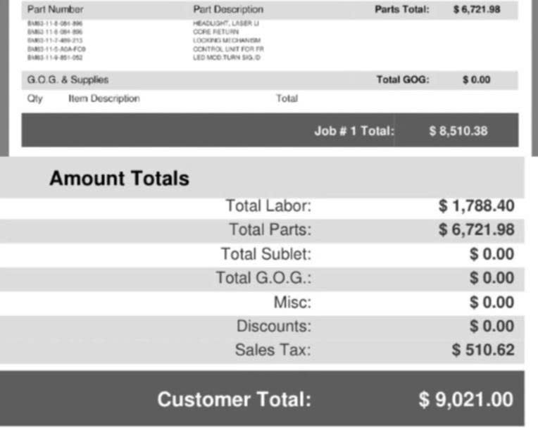 Sự việc bắt đầu khi lớp gioăng kín của cụm đèn pha Laser trên chiếc BMW M4 bị hỏng, tạo điều kiện cho hơi ẩm lọt vào bên trong gây ảnh hưởng đến khả năng vận hành. Thay vì thực hiện các biện pháp khắc phục cục bộ, đại lý chính hãng đã chỉ định thay thế toàn bộ cụm đèn mới. Theo hóa đơn được chia sẻ, giá trị linh kiện cho một bên đèn mã BM63-11-8-084-896 là 6.722 USD (176,2 triệu đồng). Khi cộng thêm 1.788 USD (46,88 triệu đồng) tiền công lắp đặt và các khoản thuế phí, tổng số tiền chủ xe phải chi trả chạm mức 9.021 USD (236,55 triệu đồng).