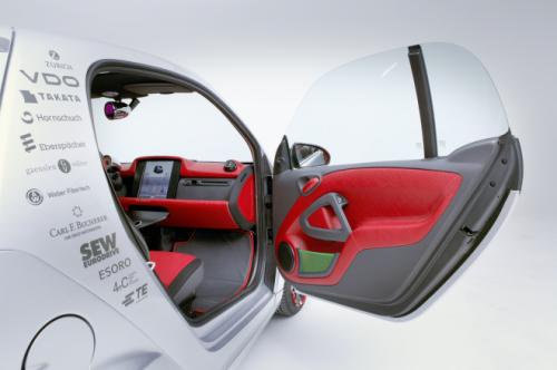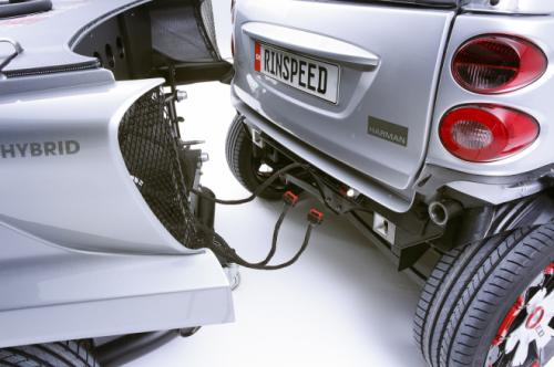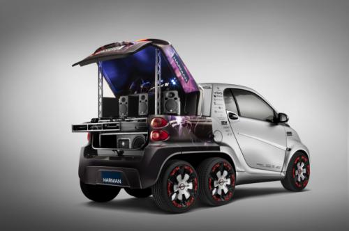 Bộ “Dock + Go” của Rinspeed có nhiều dạng. Đơn giản nhất là tạo thêm một khoang chứa đồ, chẳng hạn chuyên dùng cho các hãng giao pizza với máy giữ nhiệt gắn kèm, hay biến Smart Fortwo thành xe pick-up nhỏ xíu. Thú vị nhất chính là việc toàn bộ dock gắn thêm được tích hợp dàn âm thanh giải trí cao cấp từ Harman, có thể biến chiếc xe thành sàn nhạc di động.