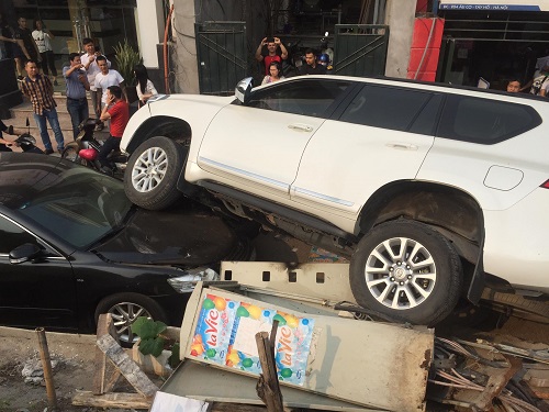 Hà Nội: Toyota Land Cruiser mất lái, rơi trúng đầu Camry