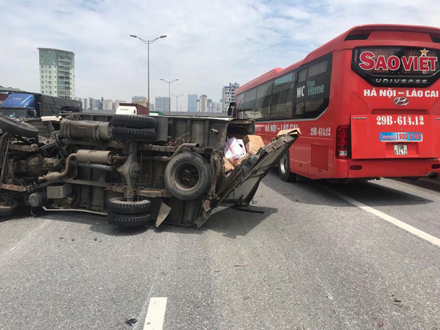 Đang lưu thông trên đường vành đai 3 trên cao (quận Thanh Xuân – Hà Nội), chiếc xe tải bất ngờ nổ lốp, gây tai nạn khiến một xe tải đi trước lật nhào.