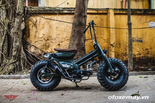 Honda Cub là một trong những tác phẩm mới gần đây nhất của Mini Bike Trung Khánh. Với nghệ danh “ King Kong”, chiếc xe honda Cub đã làm chính chủ nhân phải ngỡ ngàng trong ngày được bàn giao xe. Đúng như tên gọi, chiếc cub nguyên bản mảnh mai đã hoàn toàn lột xác, trông như chú khỉ đột dũng mãnh. Ảnh hưởng từ phong cách bobber, nên điểm đầu tiên đập vào mắt người nhìn là chiếc ghi đông cao, được uốn khá tinh tế với hai cánh cung úp ngược. Chi tiết nổi bật khác dễ dàng gây ấn tượng ngay từ ánh nhìn đầu tiên là cặp bánh siêu lớn bọc bên ngoài hai chiếc vành đúc. Để có được đặc điểm ấn tượng này, những người thợ đã phải rất tốn công sức để xử lý hệ thống khung càng.