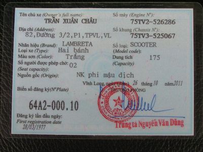 Chủ xe, ông Trần Xuân Châu, là hội trưởng CLB Vespa Vĩnh Long nhiệm kỳ 2010-2015, cho biết ông theo đuổi 10 năm mới thương lượng mua lại được chiếc xe này từ một chủ xe cũng ở Vĩnh Long. Theo ông chạy thử, xe đạt tốc độ tối đa 95km/h, lượng nhiên liệu tiêu hao khoảng 40km/lít xăng pha nhớt. Bình xăng 6 lít. Tỷ lệ pha khi đi đường trường: 5 lít xăng pha với 250ml nhớt. Chạy trong thành phố thì pha 200ml/5 lít xăng.