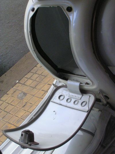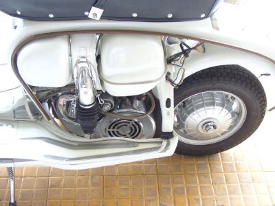 Phần khoang máy bên phải hông xe, với hai khối tròn trắng là hộc chứa dụng cụ và bình xăng. Phía dưới là ống pô gin.