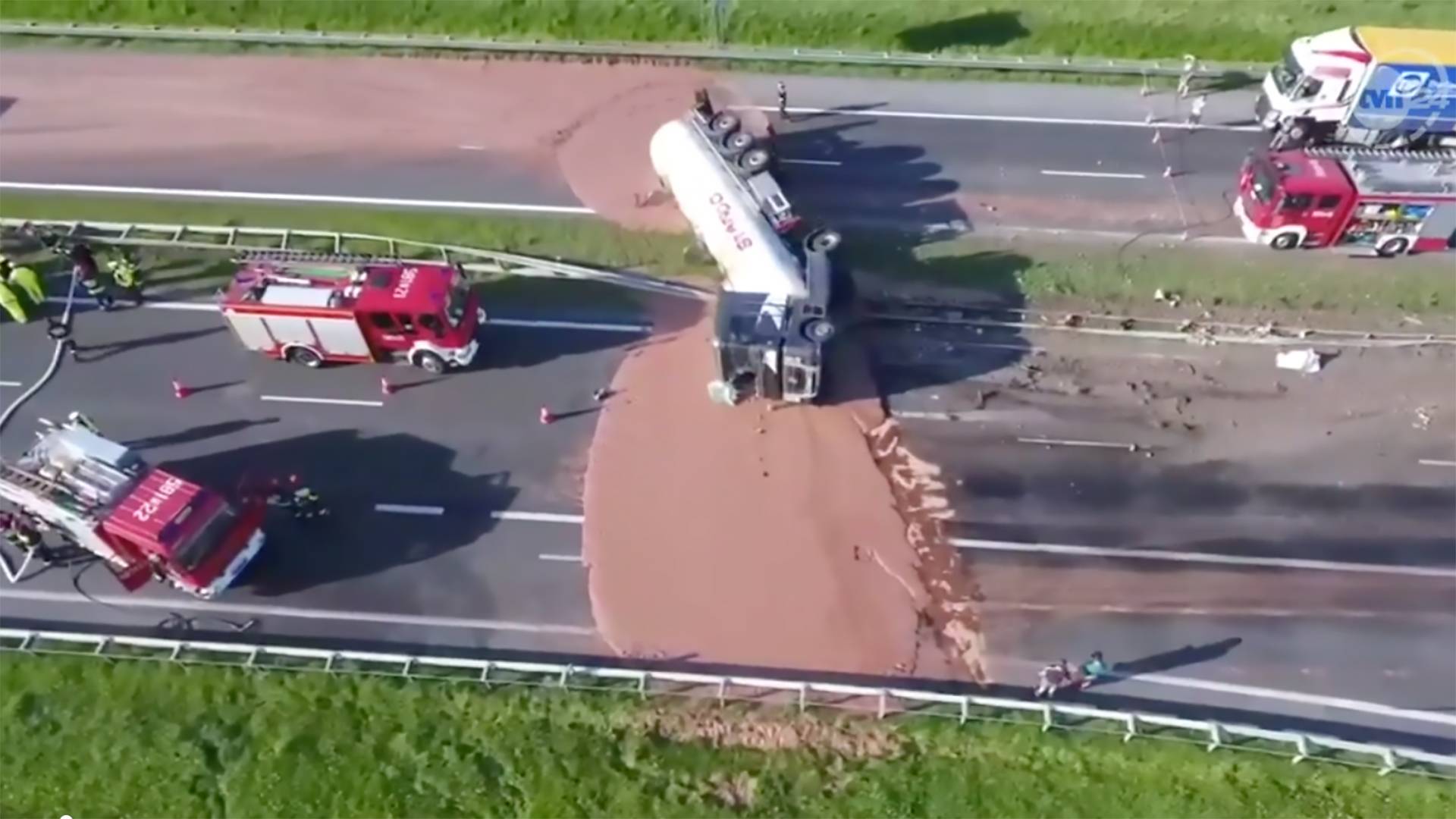 Tắc đường vì 12 tấn chocolate tràn ra từ xe đầu kéo bị lật