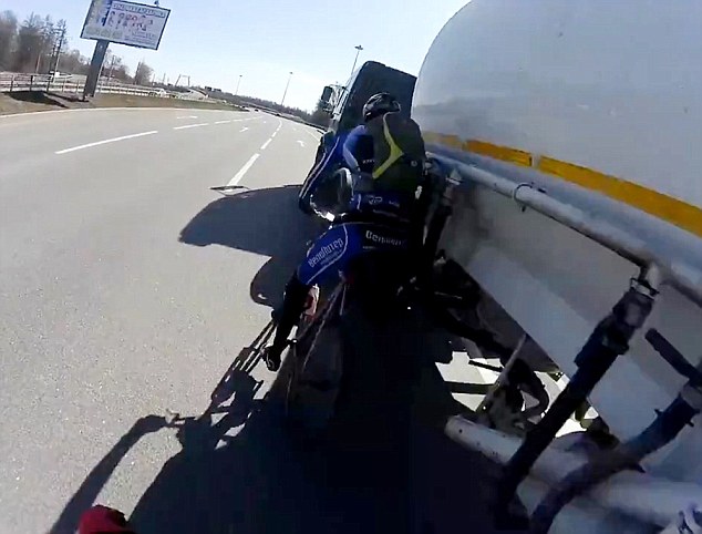 Một tay đua xe đạp tại Nga đã may mắn thoát chết sau khi bị chiếc xe tải vượt ẩu và quẹt phải trên đường cao tốc.