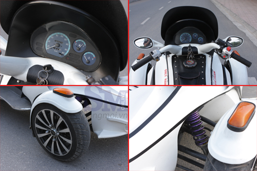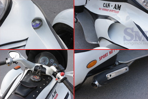 Nếu so sánh kiểu cào bằng thì Can-Am tự chế chẳng thua kém gì mẫu xịn bên trời Tây. Cũng mặt trước 4 đèn, hốc gió trước khoét sâu, cặp bánh trước nhỏ, bánh sau to, yên choãi ra sau và hông tỳ bình xăng như ATV 4 bánh. Tuy nhiên, so với đống trang bị tiền tỷ ở xe thật thì chiếc xe của anh Thắng chỉ là đồ “liên hợp quốc” nhặt nhạnh từ các cửa hàng sửa xe, chợ phụ tùng xe cũ: bảng đồng hồ của xe Matiz, bộ cùm (công tắc đề, tay ga) Honda CM, lốp trước xe Matiz 13 inch, lốp sau của xe máy scooter 16 inch. Thậm chí nhiều chi tiết như gương chỉnh lòng, đèn trước, sau, xi-nhan anh cũng chẳng quan tâm của xe nào mà lượm vừa mắt thì đem về. Ngay cả kích thước xe cũng chỉ ướm bằng mắt cỡ 1,7m. “Bản vẽ thiết kế nằm sẵn trong đầu, mình cứ thế làm xe theo cảm hứng, không quan trọng phải giống y chang nguyên mẫu”, anh Thắng nói.