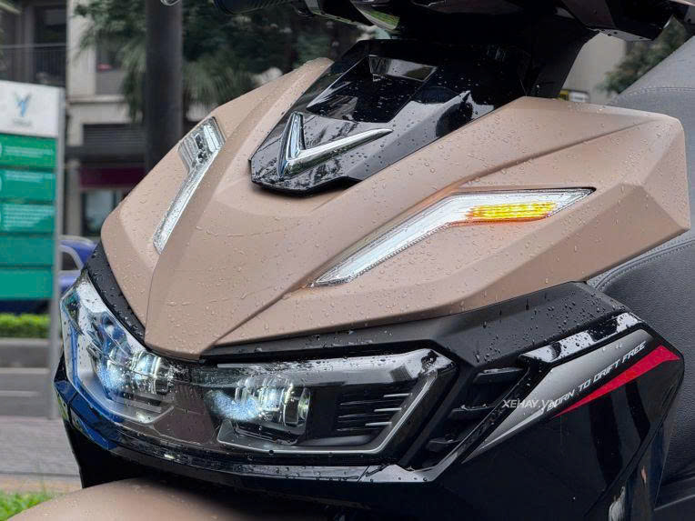 Logo chữ V đặc trưng được đặt ở vị trí trung tâm, tạo điểm nhấn nhận diện thương hiệu. Phía sau xe, cụm đèn báo rẽ được thiết kế tách rời gắn trên chắn bùn, kết hợp cùng phần đuôi vuốt nhọn, mang lại diện mạo tương đồng với các mẫu xe côn tay thể thao hiện nay.